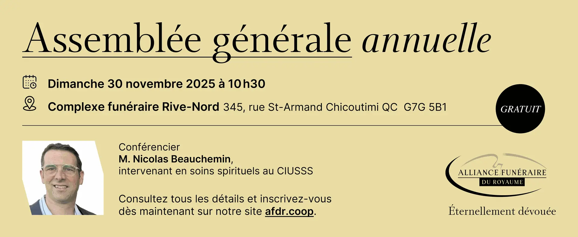 L'Assemblée générale annuelle (AGA) de l'Alliance funéraire du Royaume se tiendra le dimanche 30 novembre 2025, à 10 h 30, au Complexe funéraire Rive-Nord, situé au 345, rue St-Armand, Chicoutimi, QC G7G 5B1.